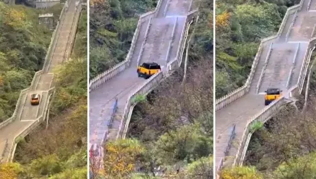 Кадрларда Land Rover Defender-ге ұқсайтын Fulwin X3L тік баспалдақпен сенімді көтеріле бастағаны анық көрінеді. Кенеттен қатты дыбыс шығып, көліктің астынан қара зат ұшып шығады да, машина оңға қарай бұрылып кетеді. Басқарудан айырылған көлік тоқтап, кейін қарай баспалдақпен сырғып, қоршауды соғады, құрылымға зақым келеді.